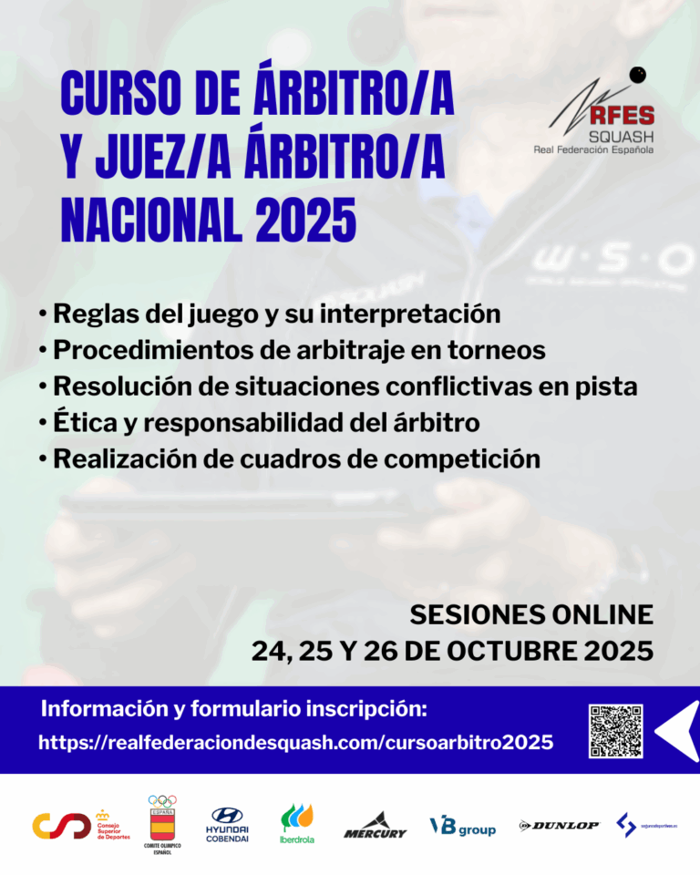 La Real Federación Española de Squash convoca el curso de Árbitro y Juez Árbitro nacional 2025.