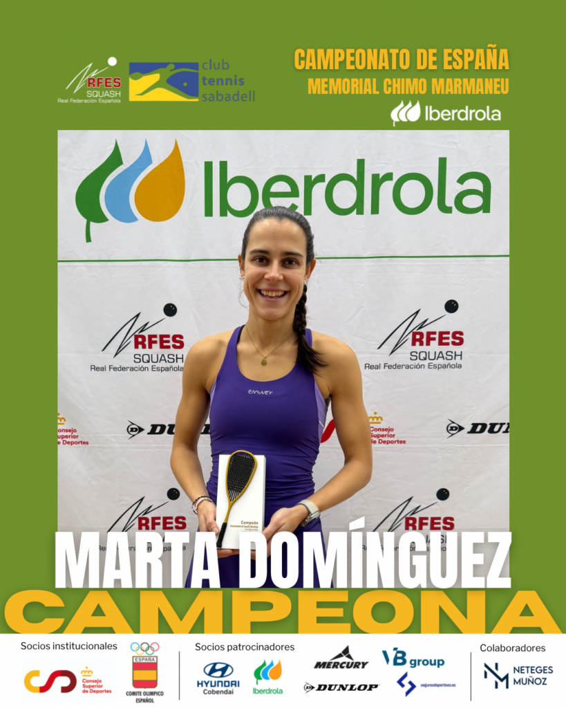 En el Campeonato de España Iberdrola Memorial Chimo Marmaneu, la número uno del cuadro, semifinalista europea y actual número 58 del ranking PSA, Marta Domínguez, ha sumado su tercer título nacional a su palmarés. La campeona en 2025 y en otras seis ocasiones, Cristina Gómez, ha sido baja por lesión y la catalana Noa Romero ha sido el mayor peligro para la gallega en el torneo. Romero, cabeza de serie número dos, hizo lo propio y se metió en su primera final al ir superando rondas y ganar en cuatro juegos a, la también catalana, Sofía Mateos en las semifinales. Domínguez, del Squash Rías Baixas, ha levantado el título por tercera vez, tras rozarlo en año pasado y acabar cediendo en el quinto ante Gómez. Con la victoria ante Romero sin perder ni un juego (3-0: 11-6, 11-3, 11-7 en 30’) se consolida como la jugadora española más fuerte del momento, tanto a nivel nacional como internacional. Mateos ha sido bronce al ganar a Icía Riveiro en tres juegos.