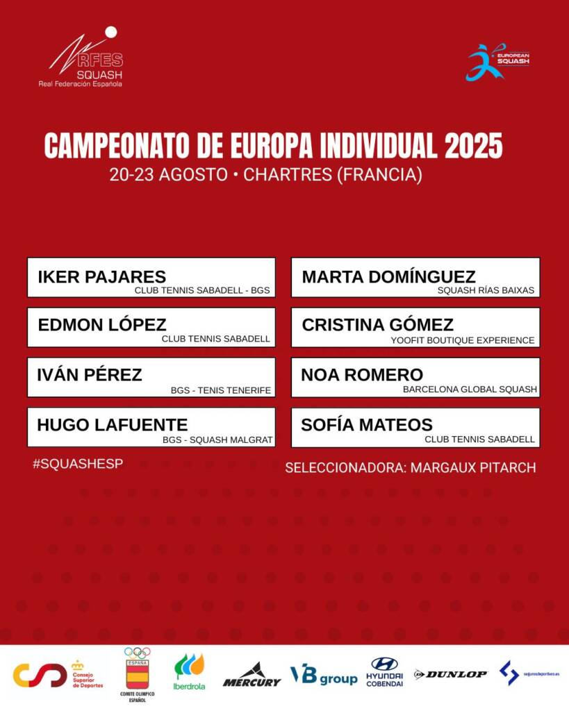Del 20 al 23 de agosto se celebra en Chartres (Francia) el Campeonato de Europa Individual de Squash. España acude a la cita con cuatro mujeres y cuatro hombres, entre quienes destacan Marta Domínguez e Iker Pajares, bronce en los recientes World Games y bronce en el europeo del año pasado, respectivamente.