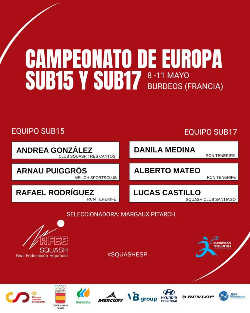 La selección nacional sub 17 la forman: Danila Medina (RCN Tenerife), campeona de España de la categoría, Alberto Mateo (RCN Tenerife) y Lucas Castillo (Squash Club Santiago), campeón y subcampeón de España, respectivamente. Los tres jugadores ya participaron en la pasada edición. En la fase de grupos los sub17 (cabeza de serie 6) se enfrentarán a: Polonia, Alemania, Noruega y Turquía, en el Grupo C.